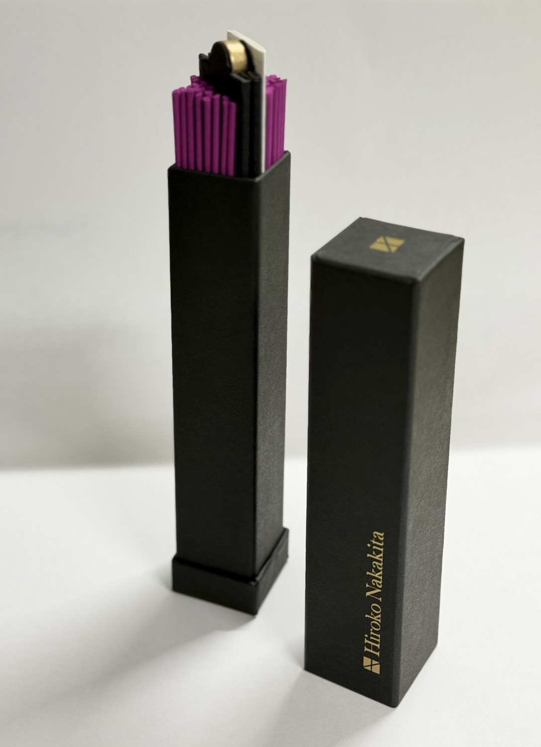 紅紫色が目を引く60本のスティック香と、シンプルな真鍮の香立てをセットにしました。到着後すぐに、その香りをお楽しみいただけます。1本の燃焼時間は約25分です。オリジナルケース付